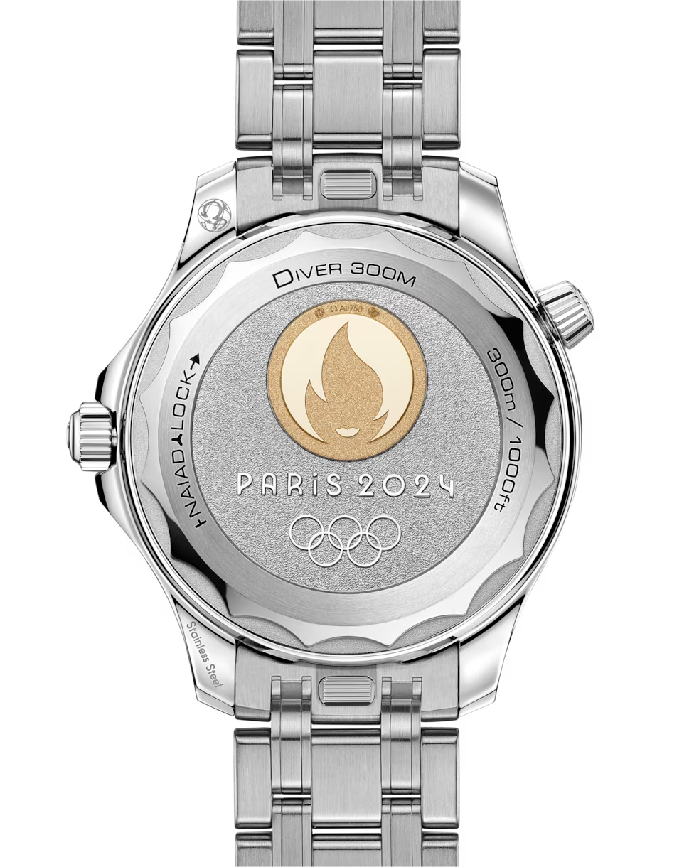 記念デザインのステンレススティール製ケースバックは、特許取得済のオメガのナイアードロックを採用。メダリオンの刻印、ミラーポリッシュ&フロスト仕上げの18Kムーンシャインゴールドで描かれたパ 2024のロゴ、そして、ミラーポリッシュ&フロスト加工の「Pari 2024」の文字および五輪の刻印が施されています。