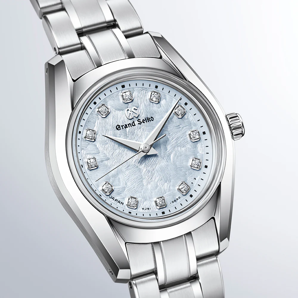 1967年の名機「62GS」を現代的にアレンジしたケースデザインは、ベゼルを排した広がりのある文字盤と、ザラツ研磨によるシャープな多面体が際立ちます。
