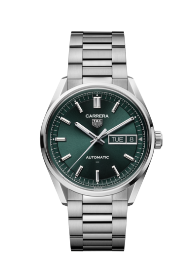 深みのあるグリーンのサンレイ仕上げダイアルが、光の移ろいによって洗練された表情を演出。 同色のフランジにホワイトの分目盛りを配し、優れた視認性を確保しました。 ロジウム仕上げの針とインデックスが調和をもたらし、3時位置にはダイアルカラーに合わせたデイデイト表示を備え、実用性も兼ね備えています。